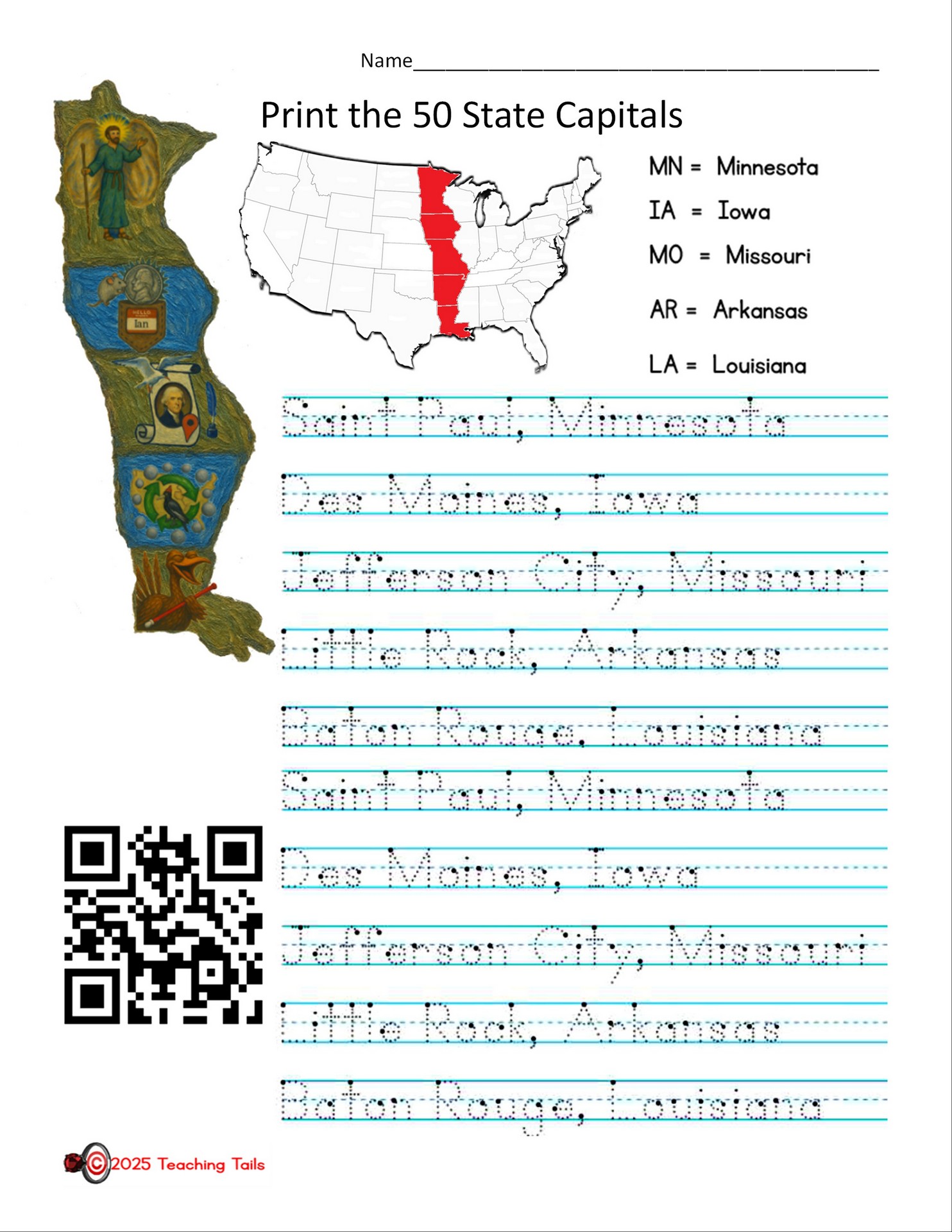 Capitals: Saint Paul, Des Moines, Jefferson City, Little Rock and Baton Rouge